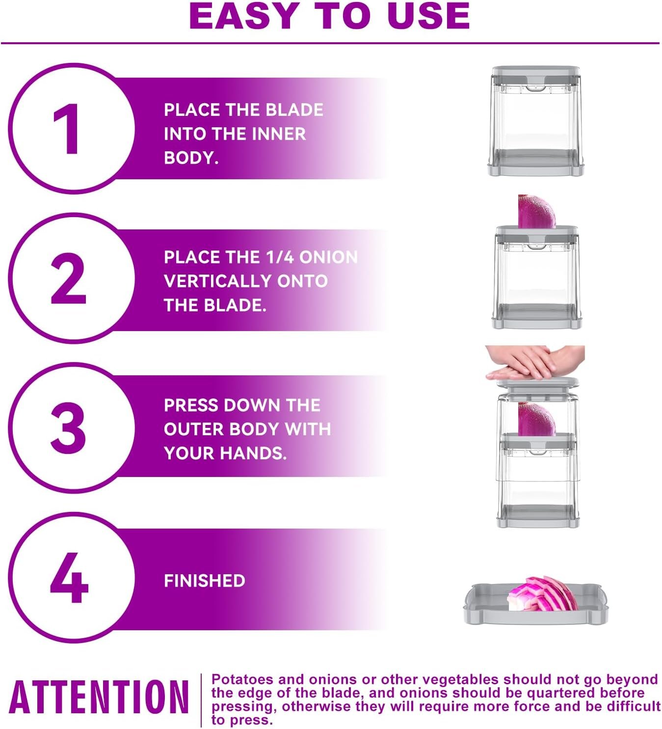 - Fruits And Vegetable Slicer: Crazy Queen onion slicer is designed for fruits and vegetables. This veggie cutter slicer is made of high quality stainless steel, with a sharp and durable blade. This onion slicer is easy to clean, and it is dishwasher safe. ATTENTION: Can’t connect the Blade Press Plate with Press Plate directly without the Outer Body, this is the mainly reason that blades won’t lock into place.