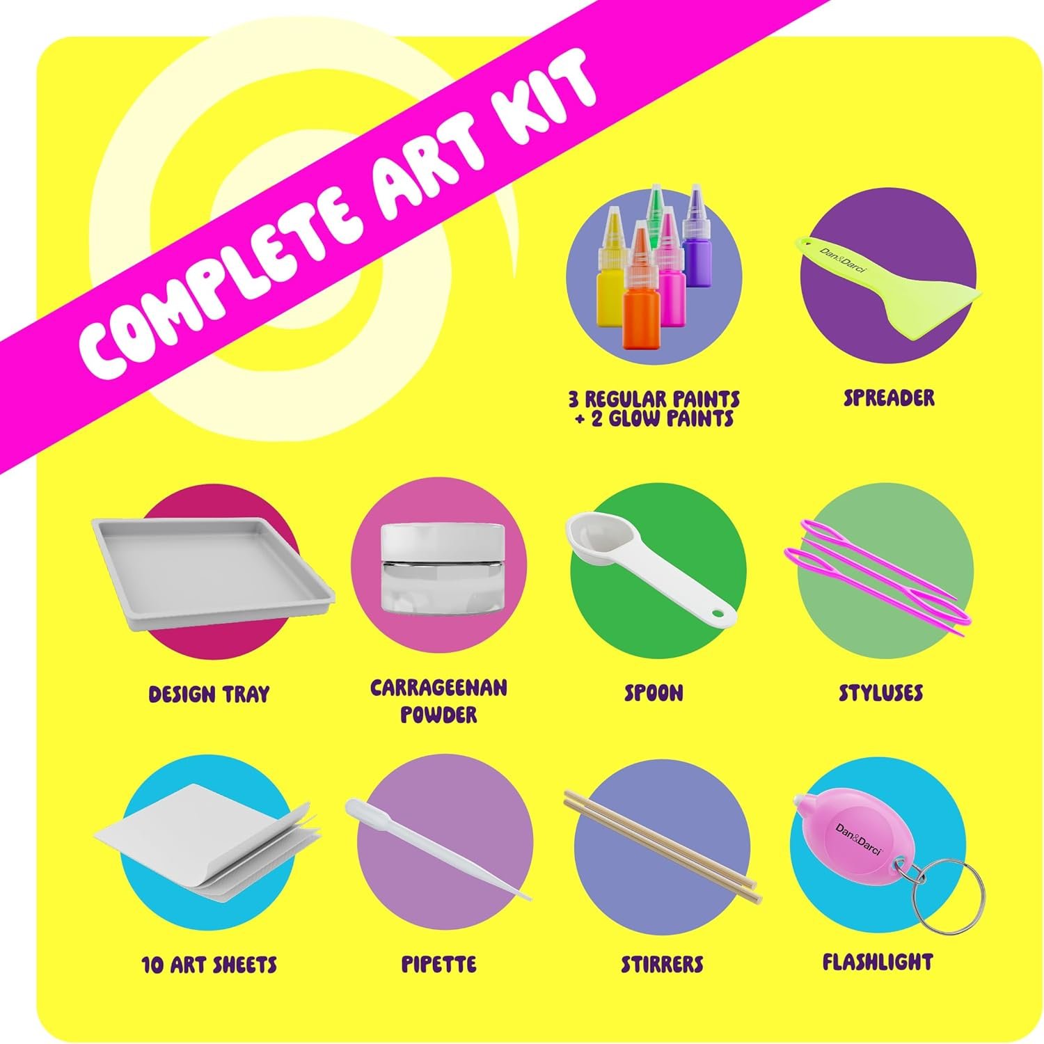 - COMPLETE ART KIT: Comes fully stocked with everything needed to start right away: art tray, 3 regular paints, 2 glow-in-the-dark paints, carrageenan powder, spreader, spoon, styluses, 10 art sheets, pipette, stirrers, and a flashlight to activate the glow effect.
